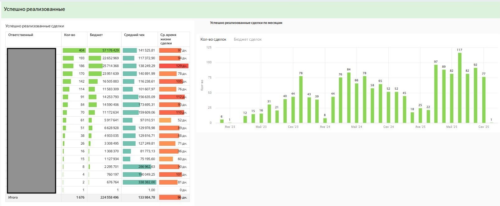 Видите, кто делает кассу компании. Этот дашборд показывает успешные сделки, средний чек и скорость продаж. Руководитель мгновенно понимает, кто приносит выручку, а кто тормозит рост — и может управлять результатом в цифрах.