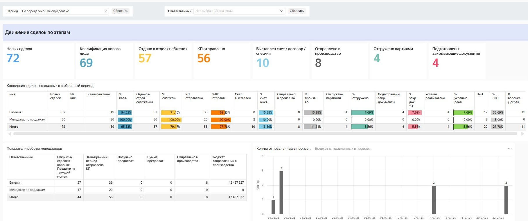 Видите, где теряются сделки и кто тормозит продажи. Этот дашборд показывает движение по этапам — от лида до производства. В один клик понятно, на каком шаге падает конверсия и где компания теряет деньги. Управляйте отделом продаж по цифрам, а не по ощущениям.